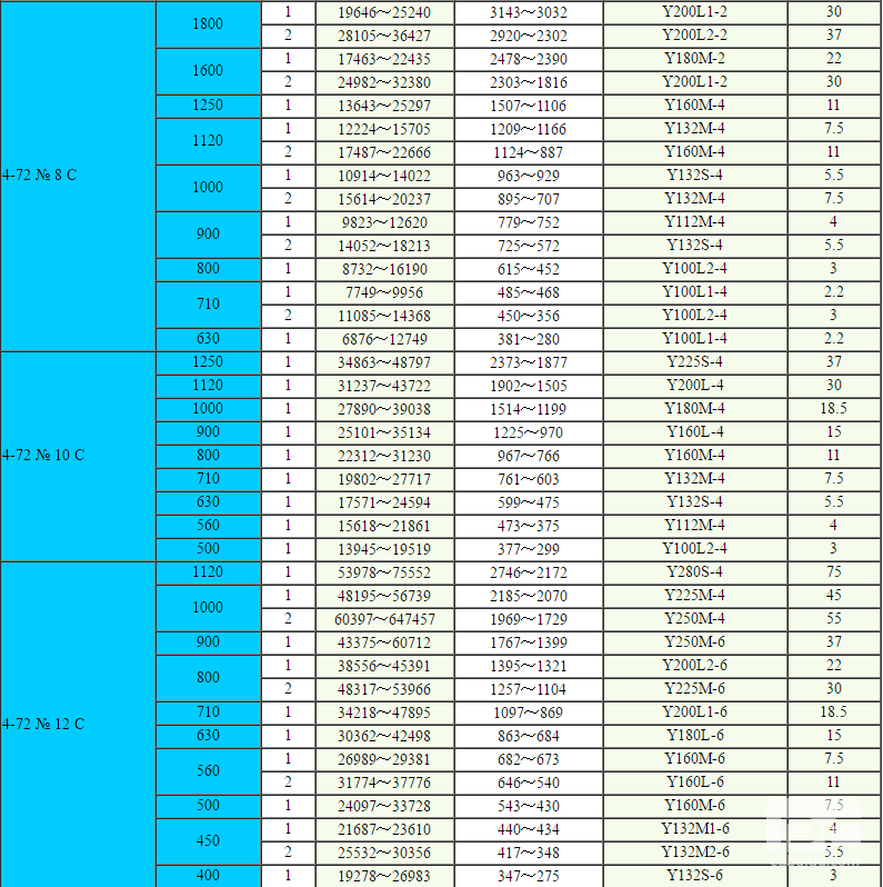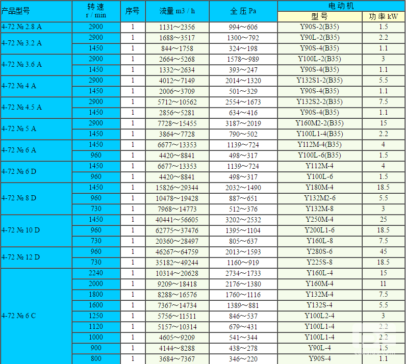 4-72型离心通风机可作为一般工厂及大型建筑物的室内通风换气用,输送空气和其他不自燃的、对人体无害的、对钢材无腐蚀性的气体。B4-72型通风机可作为易燃挥发性气体的通风换气用,气体内不许有粘性物质,所含尘土及硬质颗粒物不大于150mg/m3。气体温度不得超过80℃。B4-72型通风机的性能与选用件及地基尺寸与4-72型一致,可按其样本选择。该风机结构基本与4-72型相同。No2.8~6A采用B35型带法兰盘与底脚的电动机,No6~12C、D电动机选用该表中与Y系列对应的YB系列,安装型式为B3。